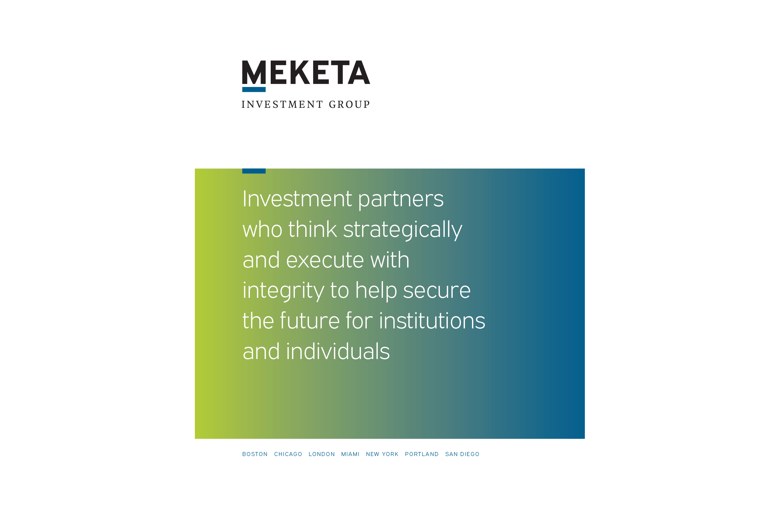 The Meketa wordmark now projects a bold, modern approach to helping institutional investors achieve their financial goals. The bar under the “M” serves as a visual anchor, a connection to the firm’s original mark, and a unifying visual element across communications.